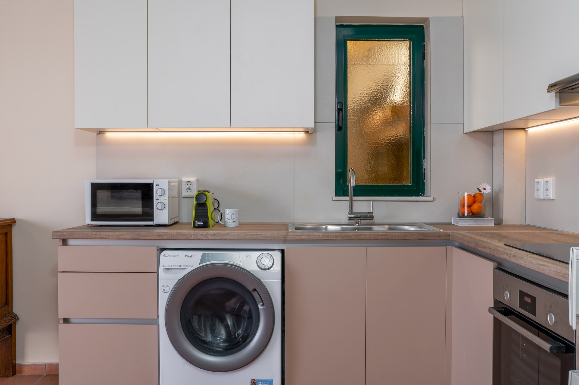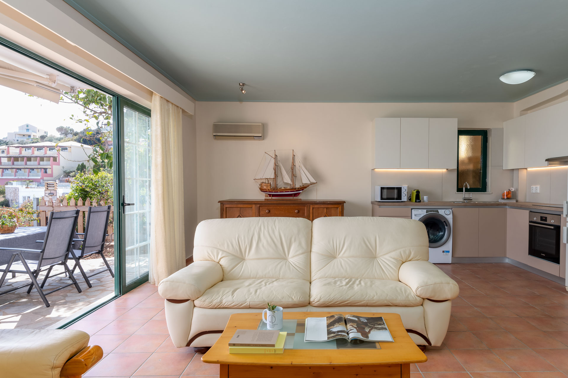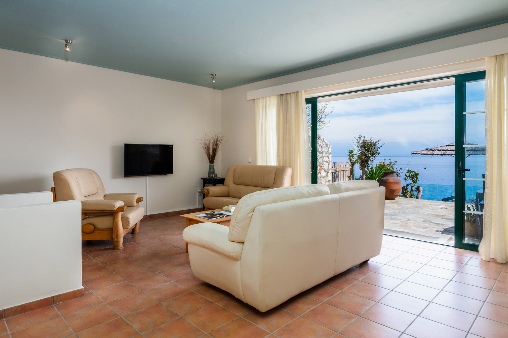 Καθώς κατεβαίνετε στον κάτω όροφο, θα φτάσετε στο σαλόνι, την τραπεζαρία και την πλήρως εξοπλισμένη κουζίνα. Ένα σαλόνι για να χαλαρώσετε και μια τραπεζαρία για να απολαύσετε ένα γεύμα ενώ απολαμβάνετε τη θέα στο Ιόνιο. Δύο επισκέπτες θα μπορούσαν επίσης να κοιμηθούν στο σαλόνι, επομένως αναφέρεται για 4, ωστόσο αν θέλετε να έχετε ένα 5ο και 6ο άτομο, οι δύο καναπέδες μετατρέπονται σε κρεβάτια.