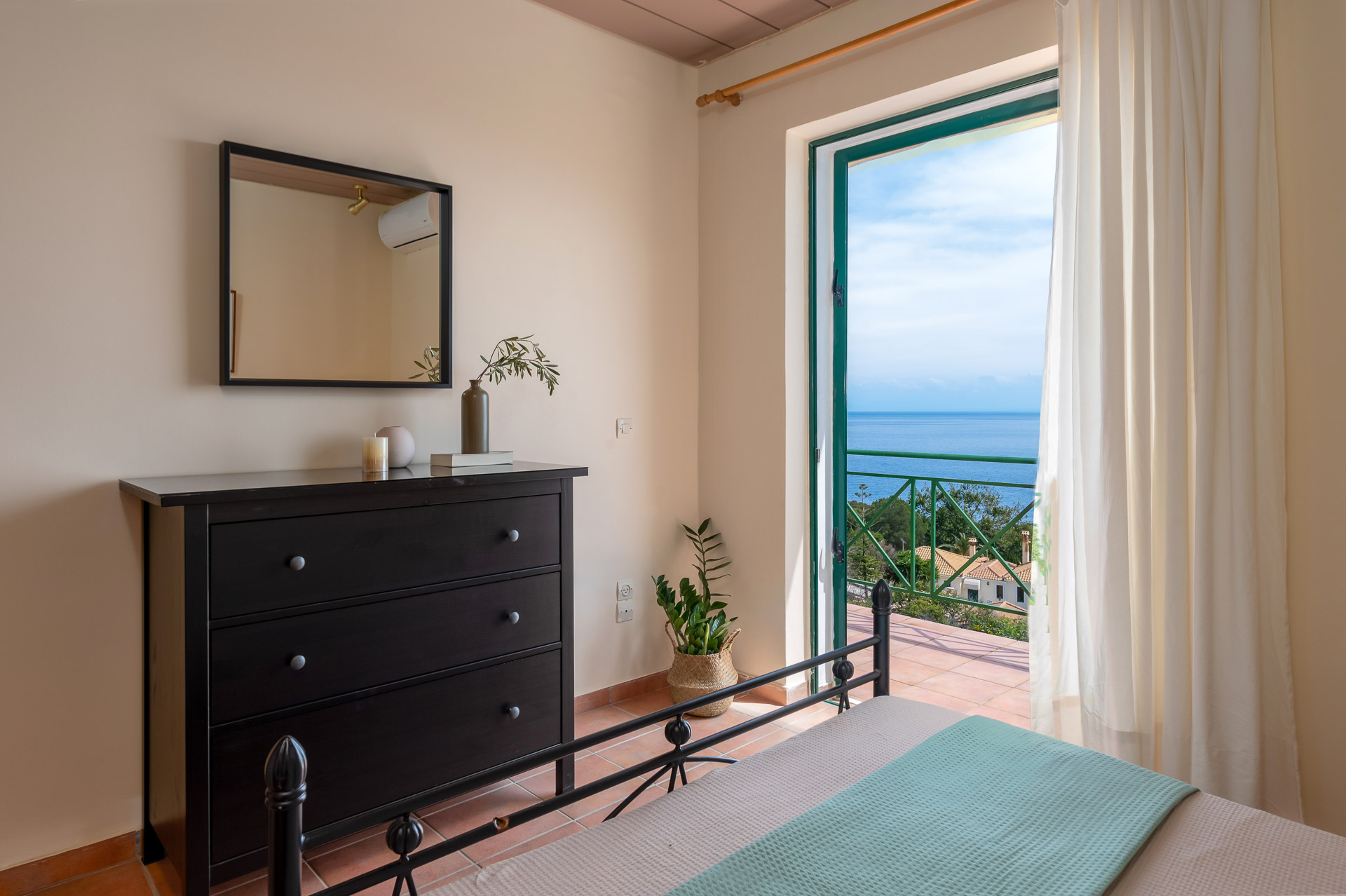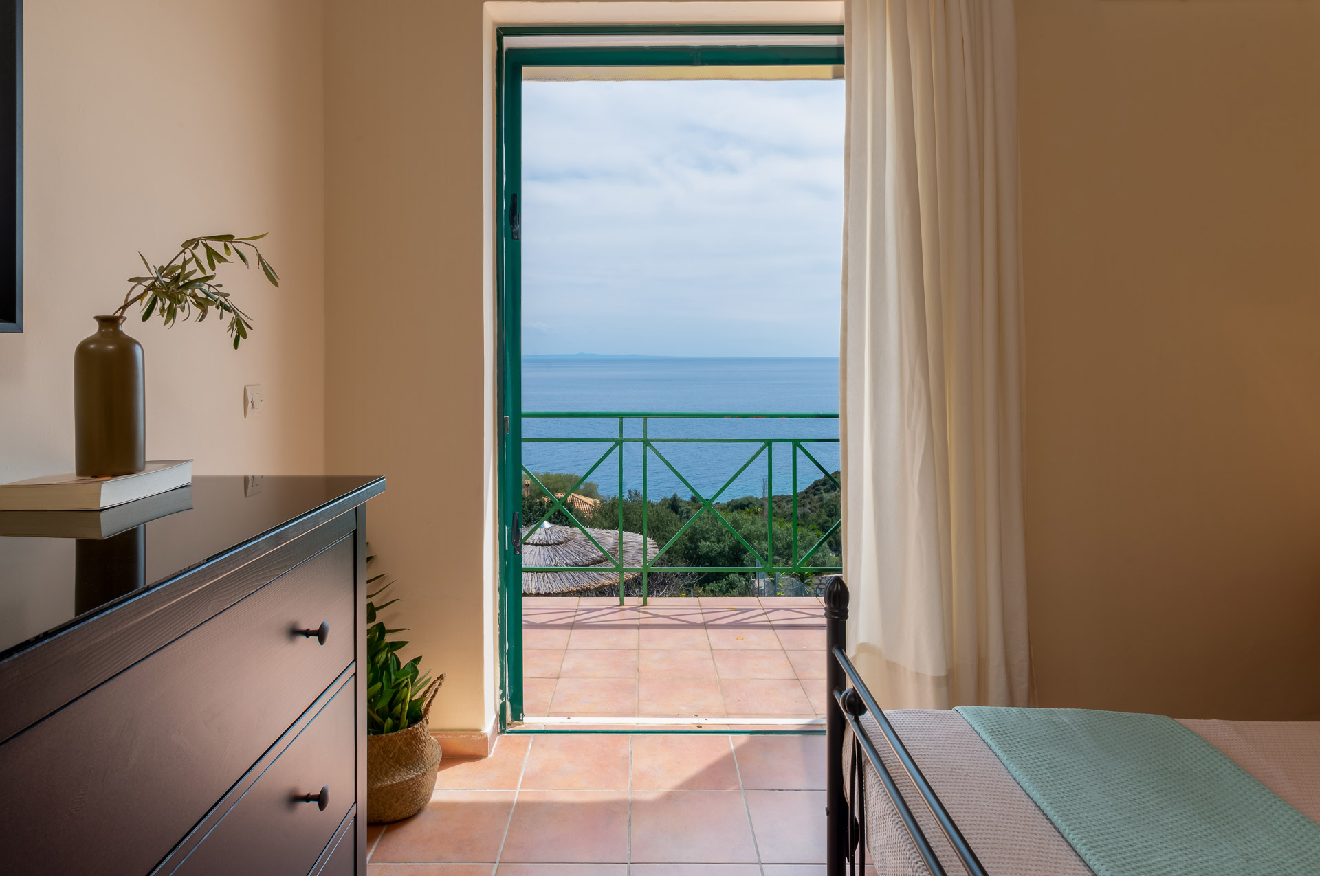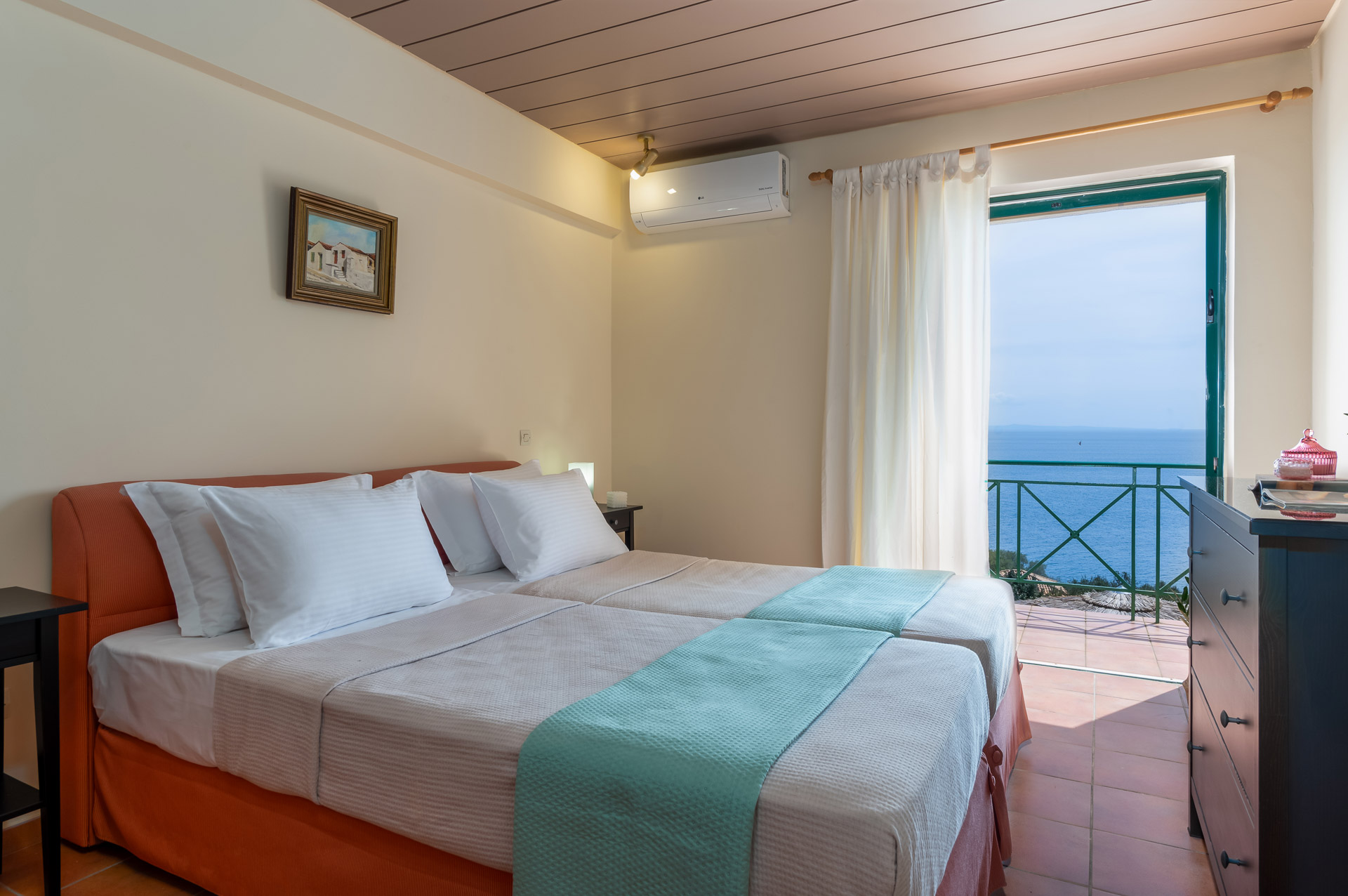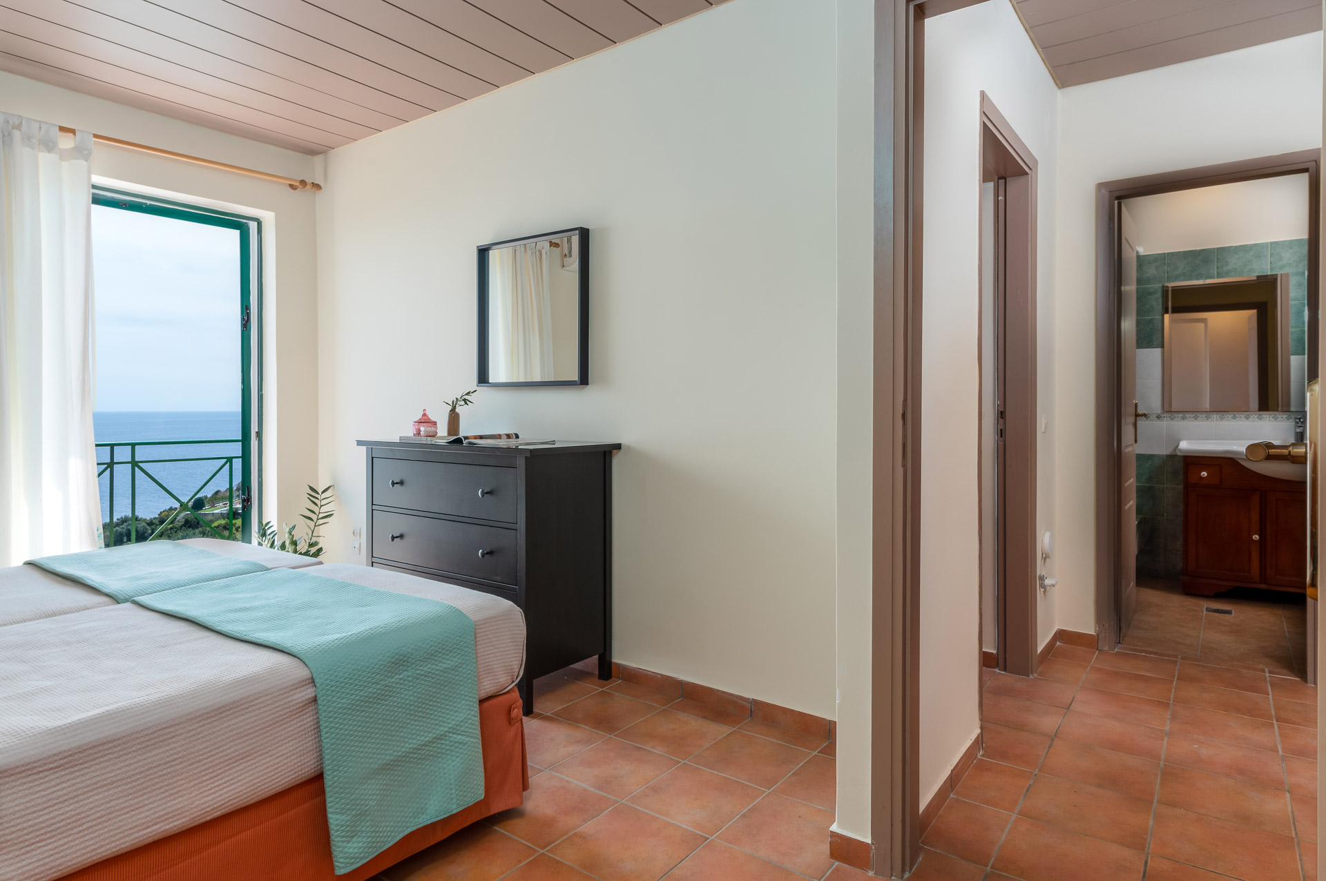 Μπαίνοντας στη Villa Jerry, στον πρώτο όροφο θα βρείτε δύο υπνοδωμάτια, το ένα υπνοδωμάτιο έχει ένα διπλό κρεβάτι, το άλλο έχει δύο μονά κρεβάτια που μπορούν επίσης να συναρμολογηθούν για να γίνει ένα αν χρειαστεί. Τα δύο υπνοδωμάτια έχουν μπαλκόνι με θέα στο πανέμορφο Ιόνιο πέλαγος, ενώ σε μια εντυπωσιακή Κεφαλονίτικη μέρα βλέπετε μέχρι την ηπειρωτική Ελλάδα και τη Ζάκυνθο . Θα σας καταπλήξει.